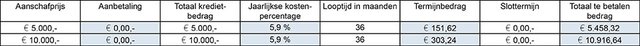 | Contantprijs | Aanbetaling | Totaal kredietbedrag | Totaal te betalen bedrag | Slottermijn | Maandbedrag |